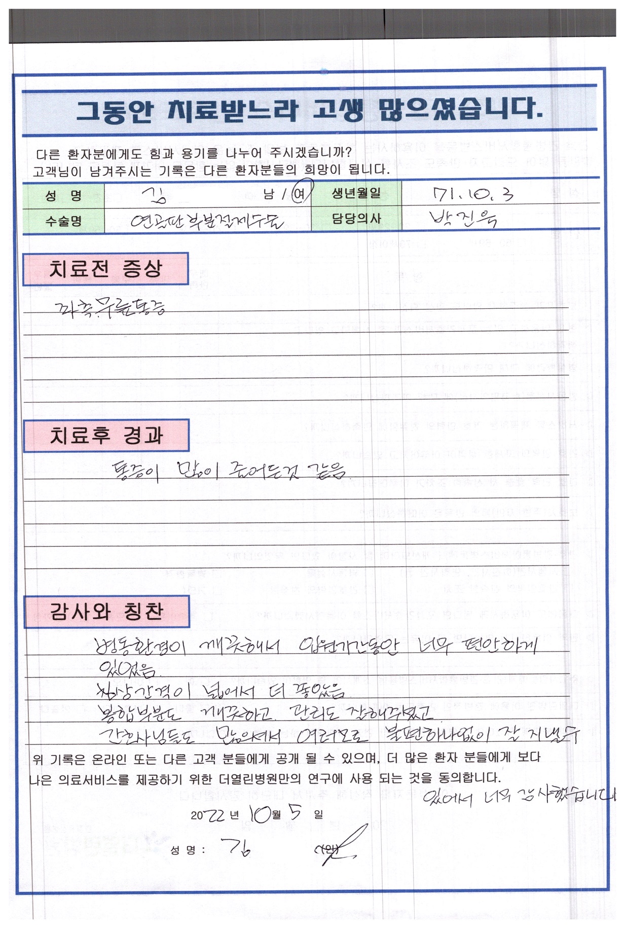 좌측 반월상연골절제술 페이지 정보 작성자 관리자 댓글 0건 조회 75회 작성일 22-11-04 12:10 본문 목록 이전글우측 전방십자인대 재건술, 반월상연골절제술 22.11.04 다음글우측 무릎 인공관절치환술 22.11.04 댓글목록 댓글목록 등록된 댓글이 없습니다.