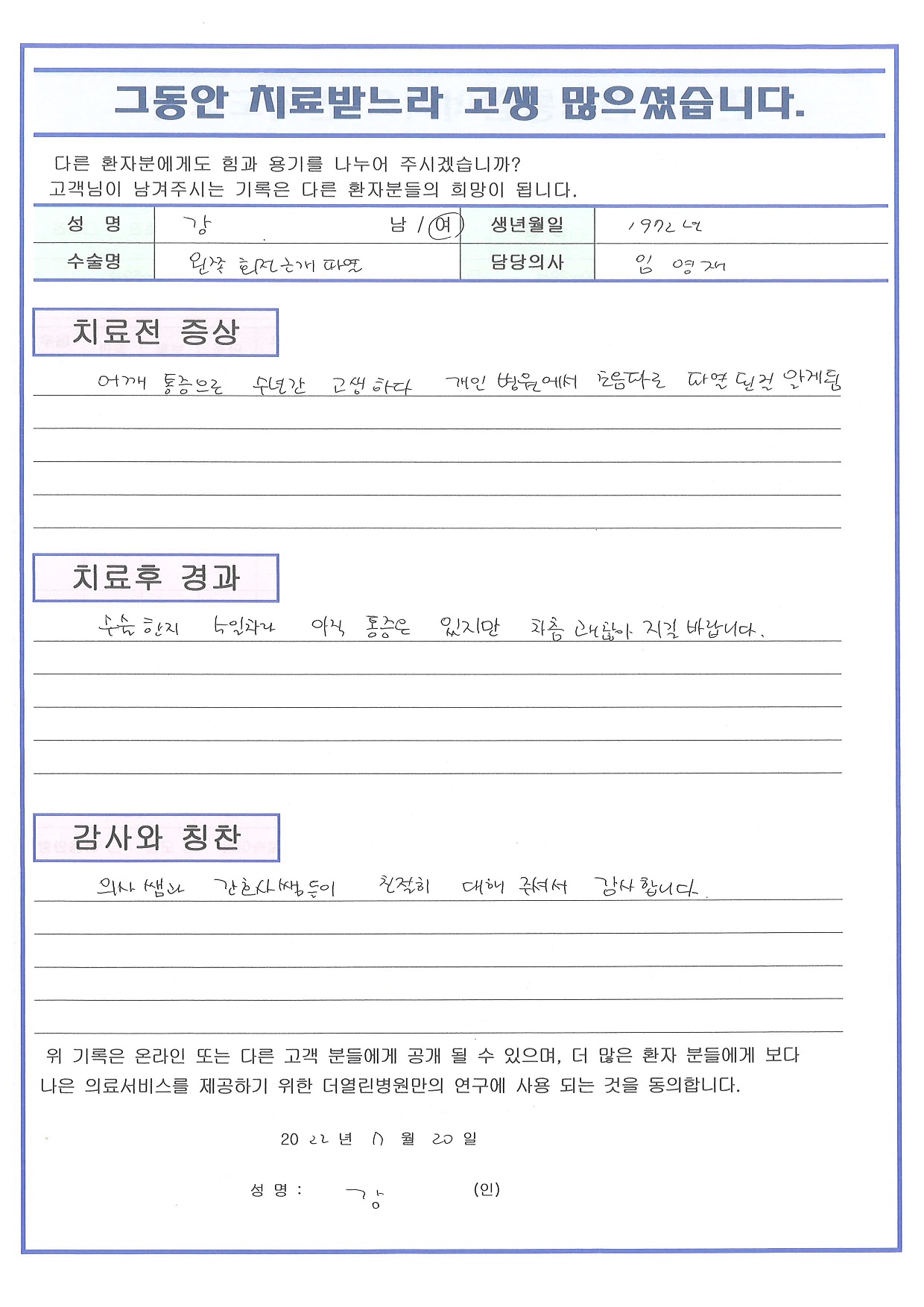 견봉성형술 및 회전근개 봉합술 페이지 정보 작성자 관리자 댓글 0건 조회 152회 작성일 22-08-03 16:10 본문 목록 이전글우측 반월상연골절제술 22.08.03 다음글좌측 무릎인공관절치환술 22.08.03 댓글목록 댓글목록 등록된 댓글이 없습니다.