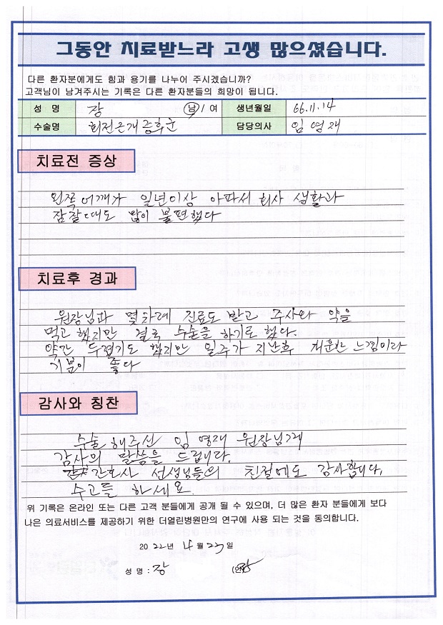 회전근봉합슬 페이지 정보 작성자 관리자 댓글 0건 조회 85회 작성일 22-05-06 12:22 본문 목록 이전글좌측 무릎 인공관절치환술 22.05.06 다음글좌측 반월상연골절제술 22.05.06 댓글목록 댓글목록 등록된 댓글이 없습니다.