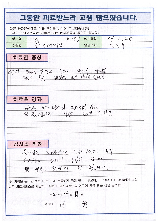 전방십자인대 재건술 페이지 정보 작성자 관리자 댓글 0건 조회 84회 작성일 22-05-06 12:27 본문 목록 이전글좌측 무릎 인공관절치환술 22.06.08 다음글우측 반월상 연골 절제술 22.05.06 댓글목록 댓글목록 등록된 댓글이 없습니다.