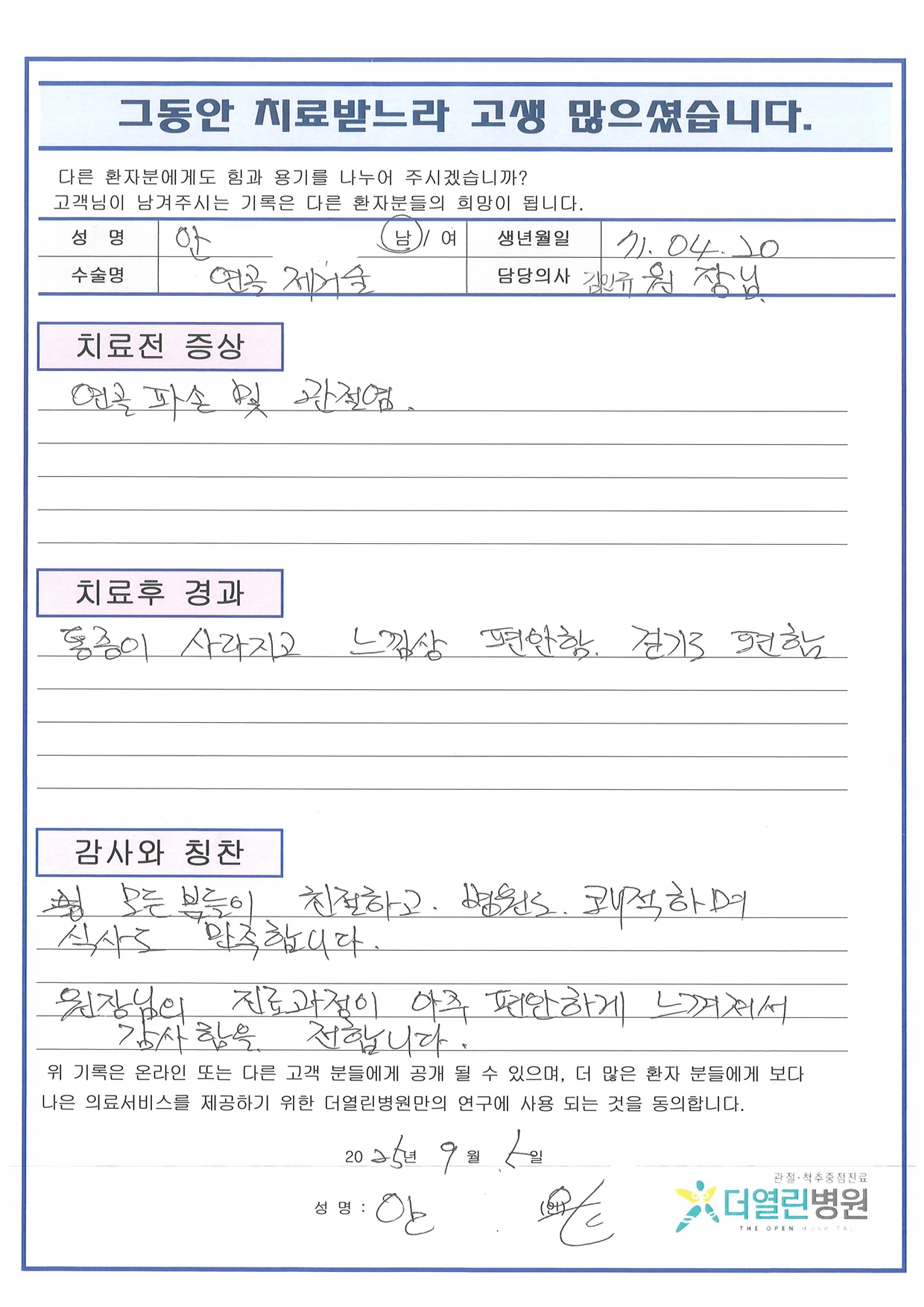 좌측 무릎 내측반월상연골 절제술 페이지 정보 작성자 관리자 댓글 0건 조회 25회 작성일 25-10-04 10:23 본문 목록 이전글좌측 무릎 인공관절치환술 25.10.04 다음글우측 무릎 내측반월상연골절제술 25.10.04 댓글목록 댓글목록 등록된 댓글이 없습니다.