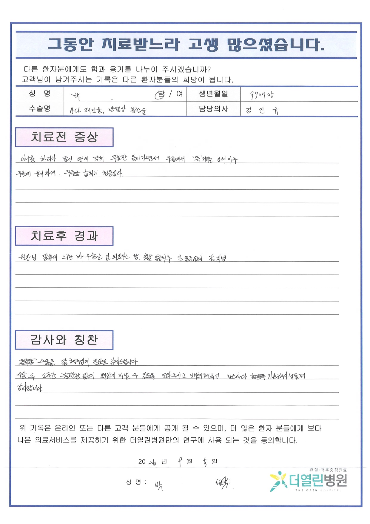 좌측 무릎 전방십자인대재건술 및 내측반월상연골봉합술 페이지 정보 작성자 관리자 댓글 0건 조회 32회 작성일 25-10-04 10:24 본문 목록 이전글우측 종골 골절정복 후 금속못 고정술 25.10.04 다음글좌측 무릎 인공관절치환술 25.10.04 댓글목록 댓글목록 등록된 댓글이 없습니다.