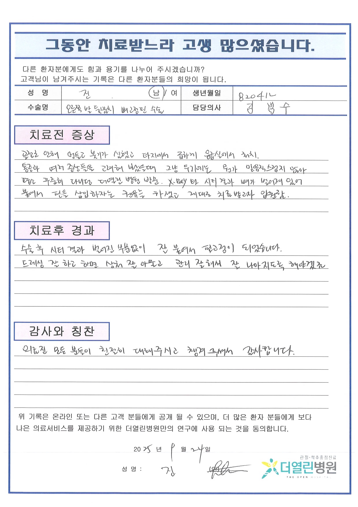 우측 종골 골절정복 후 금속못 고정술 페이지 정보 작성자 관리자 댓글 0건 조회 44회 작성일 25-10-04 10:24 본문 목록 이전글우측 무릎 내측반월상연골부분절제술 25.10.04 다음글좌측 무릎 전방십자인대재건술 및 내측반월상연골봉합술 25.10.04 댓글목록 댓글목록 등록된 댓글이 없습니다.