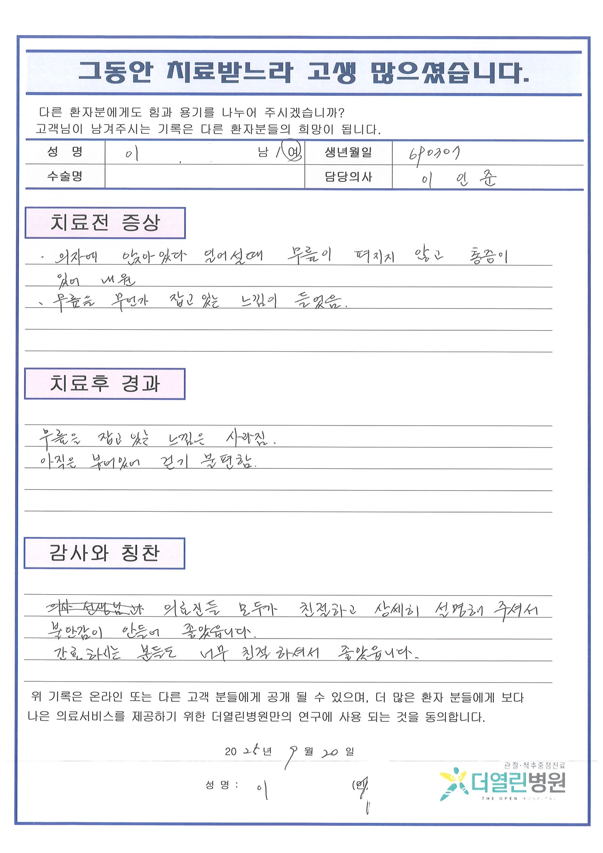 우측 무릎 내측반월상연골부분절제술 페이지 정보 작성자 관리자 댓글 0건 조회 47회 작성일 25-10-04 10:24 본문 목록 이전글좌측 무릎 인공관절치환술 25.11.06 다음글우측 종골 골절정복 후 금속못 고정술 25.10.04 댓글목록 댓글목록 등록된 댓글이 없습니다.