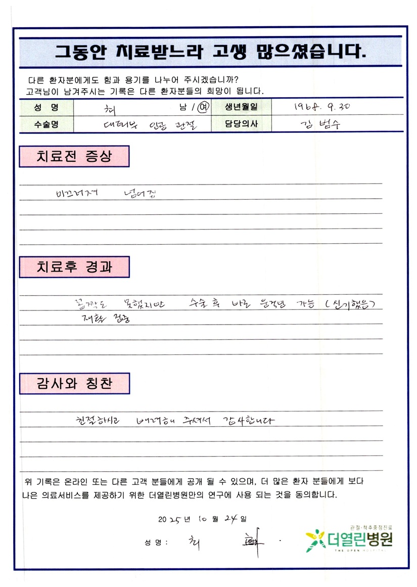 좌측 고관절 인공관절치환술 페이지 정보 작성자 관리자 댓글 0건 조회 41회 작성일 25-11-06 13:26 본문 목록 이전글좌측 무릎 반월상연골절제술 25.11.06 다음글우측 무릎 전방십자인대 재건술 25.11.06 댓글목록 댓글목록 등록된 댓글이 없습니다.