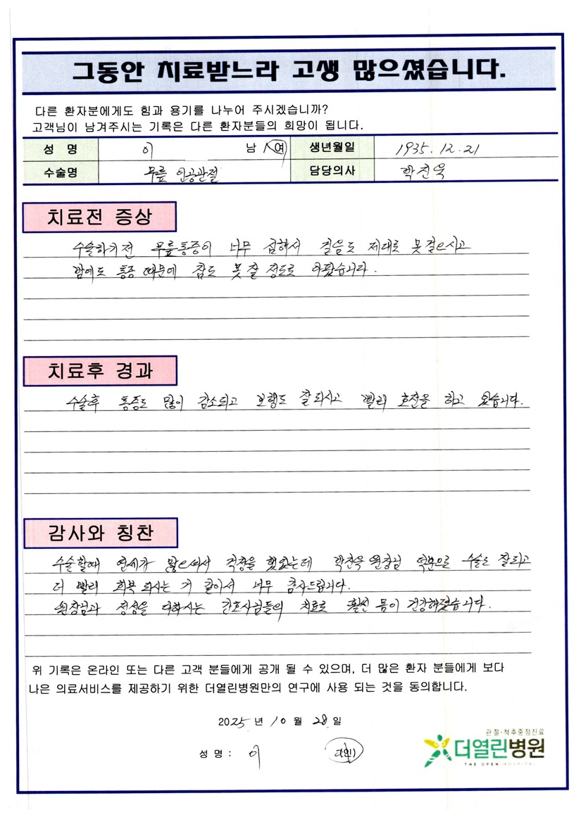 좌측 무릎 인공관절치환술 페이지 정보 작성자 관리자 댓글 0건 조회 46회 작성일 25-11-06 13:26 본문 목록 이전글좌측 원위 대퇴 관혈적 정복술 및 내고정술 25.12.03 다음글좌측 무릎 반월상연골절제술 25.11.06 댓글목록 댓글목록 등록된 댓글이 없습니다.