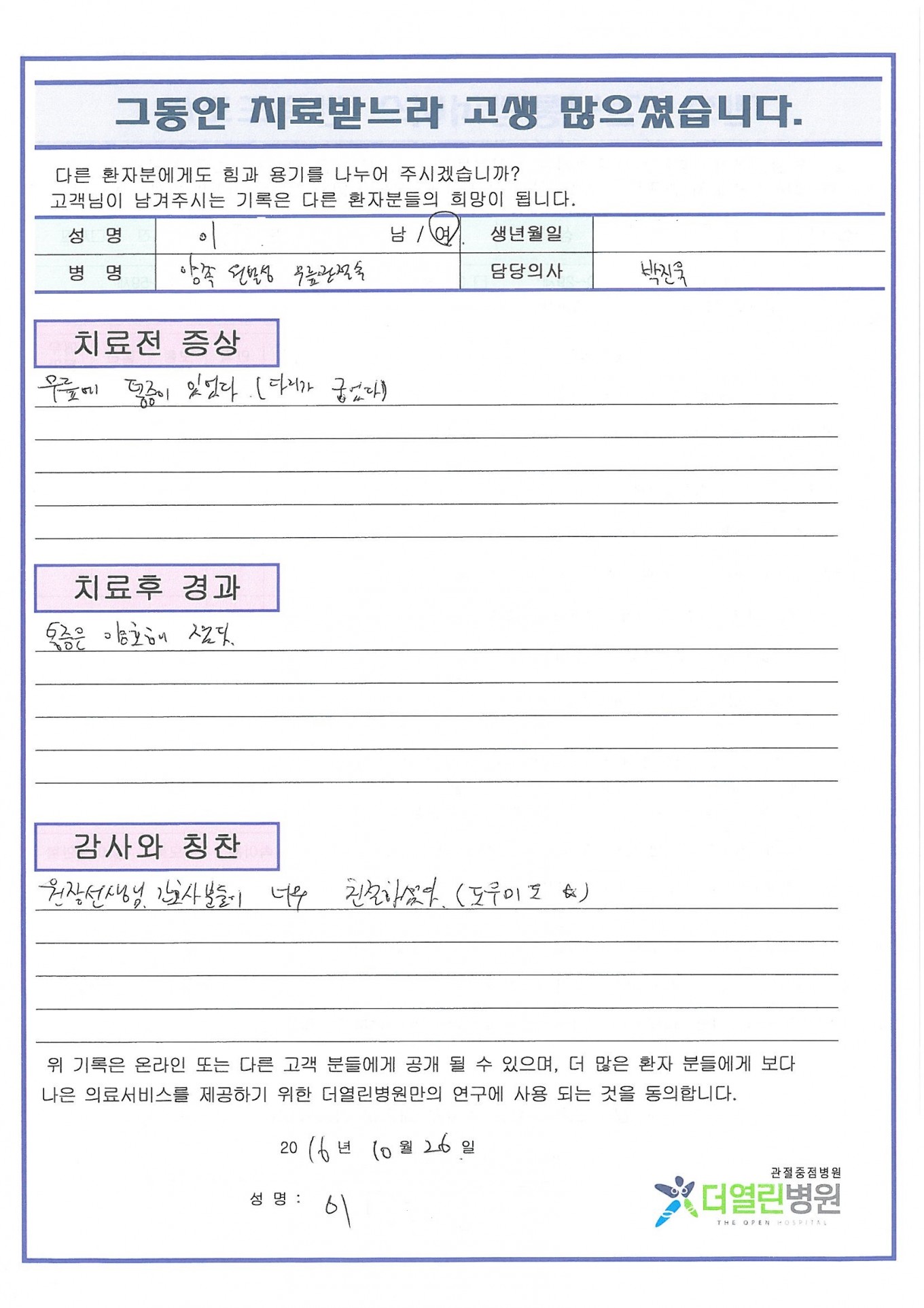 양쪽 원발성 무릎관절증 페이지 정보 작성자 관리자 댓글 0건 조회 70회 작성일 17-01-27 13:54 본문 . 목록 이전글내측 반달연골의 찢김 17.01.28 다음글양쪽 원발성 무릎관절증 17.01.27 댓글목록 댓글목록 등록된 댓글이 없습니다.