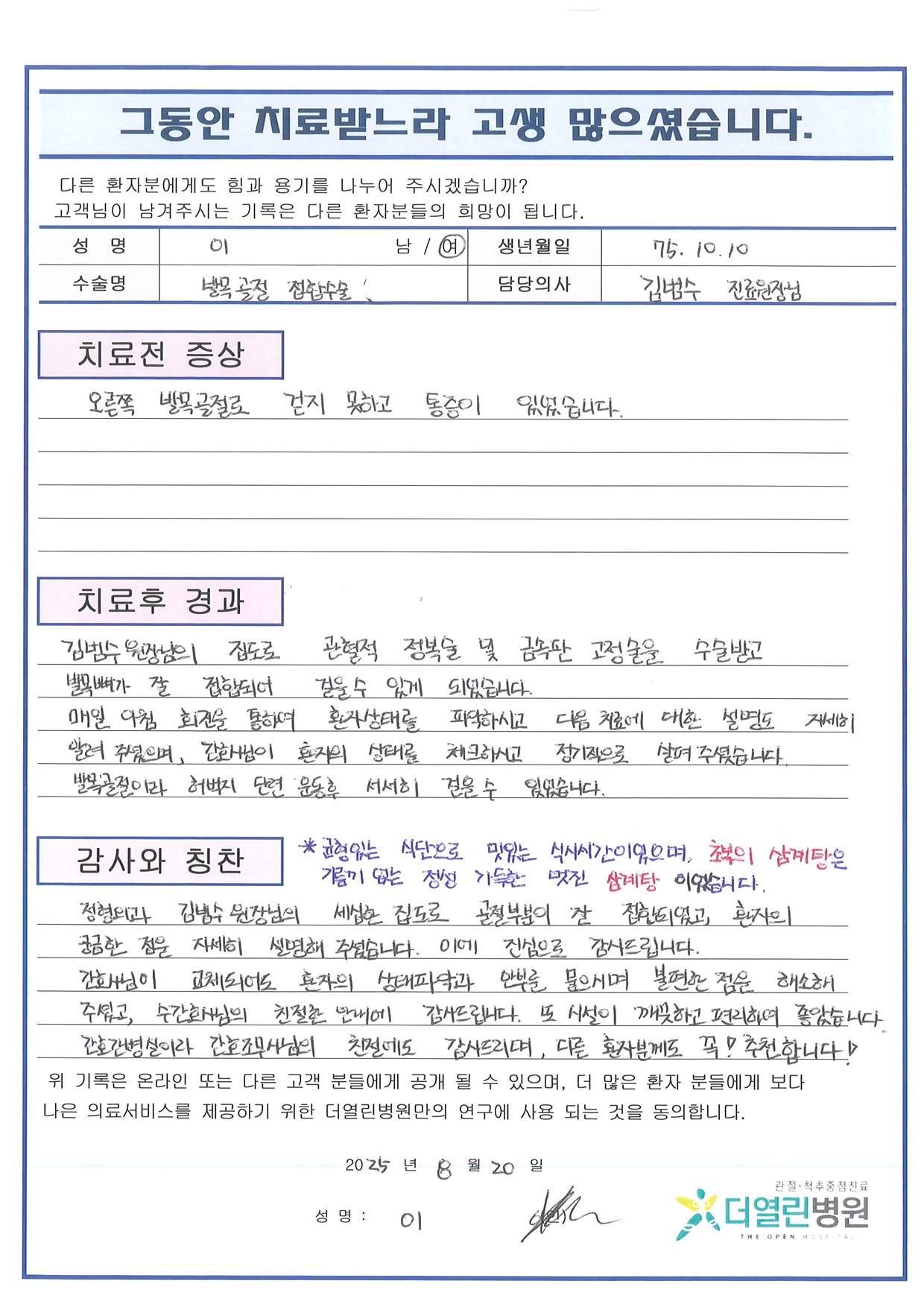 좌측 발목 관혈적 정복술 및 금속판 고정술 페이지 정보 작성자 관리자 댓글 0건 조회 53회 작성일 25-09-04 11:04 본문 목록 이전글우측 종골 관혈적 정복술 및 금속판, 금속못 고정술 25.09.04 다음글우측 고관절 인공관철 반치환술 25.09.04 댓글목록 댓글목록 등록된 댓글이 없습니다.