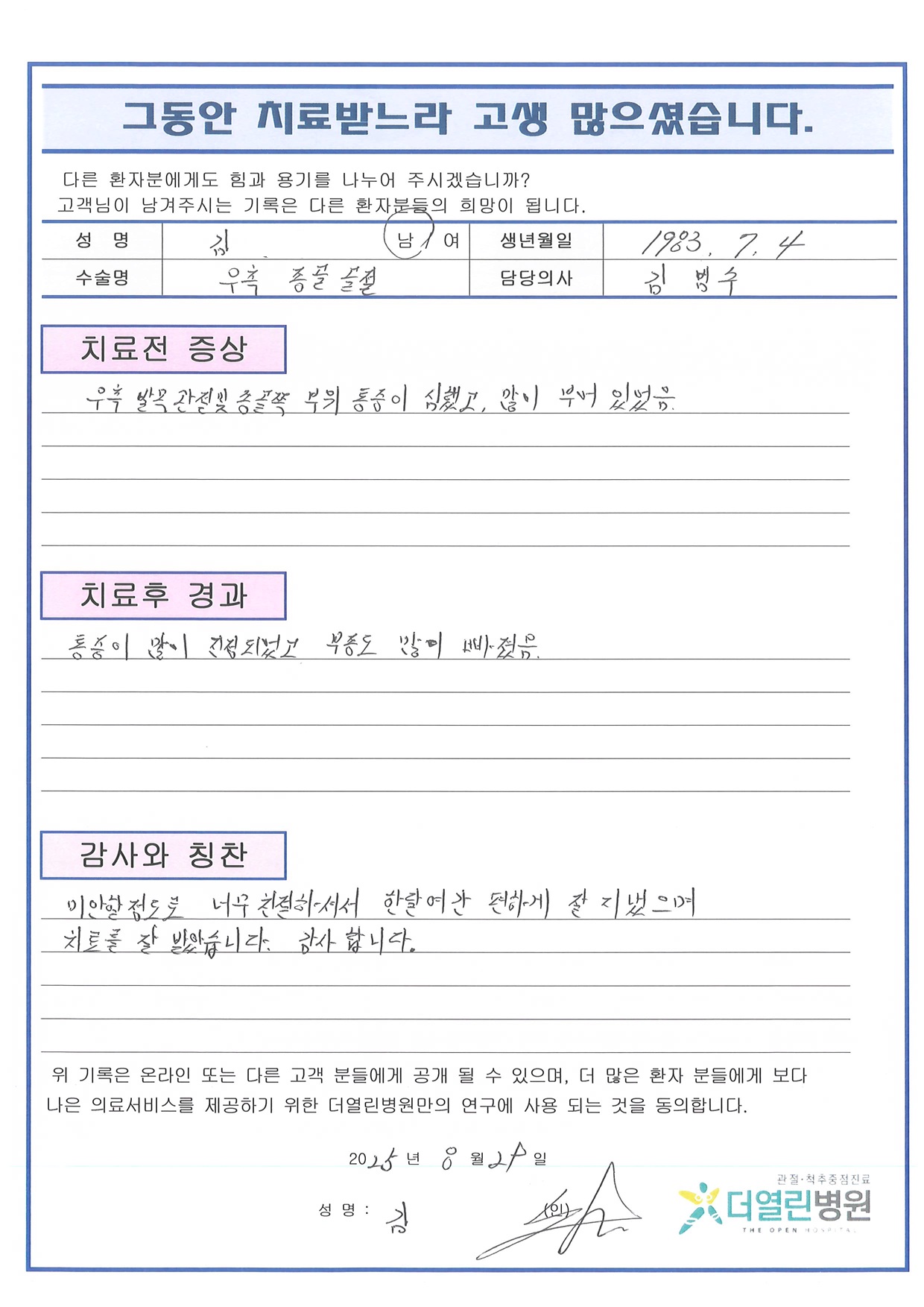 우측 종골 관혈적 정복술 및 금속판, 금속못 고정술 페이지 정보 작성자 관리자 댓글 0건 조회 67회 작성일 25-09-04 11:06 본문 목록 이전글우측 발 비관혈적 정복술 및 내고정술 25.09.04 다음글좌측 발목 관혈적 정복술 및 금속판 고정술 25.09.04 댓글목록 댓글목록 등록된 댓글이 없습니다.