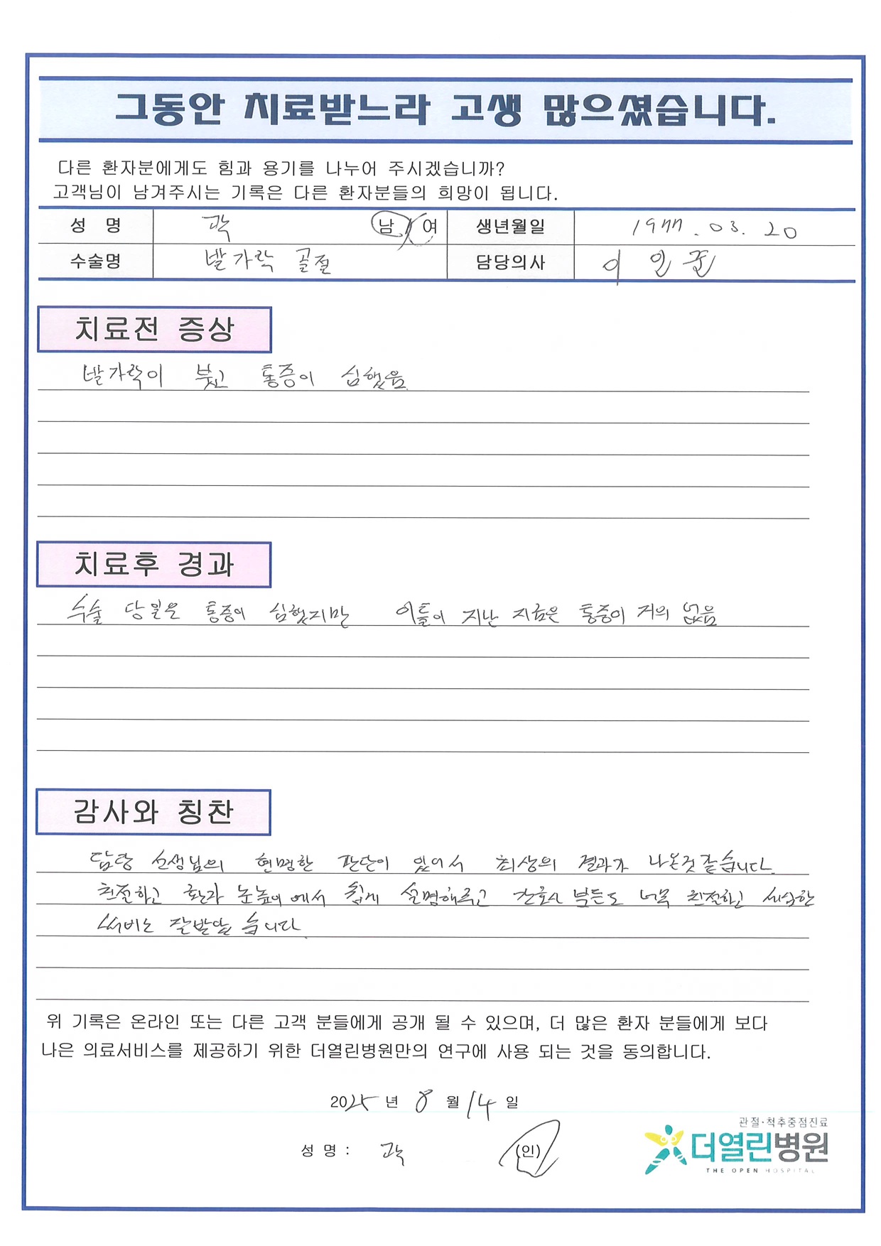 우측 발 비관혈적 정복술 및 내고정술 페이지 정보 작성자 관리자 댓글 0건 조회 155회 작성일 25-09-04 11:07 본문 목록 이전글우측 반월상연골판부분절제술 25.09.04 다음글우측 종골 관혈적 정복술 및 금속판, 금속못 고정술 25.09.04 댓글목록 댓글목록 등록된 댓글이 없습니다.