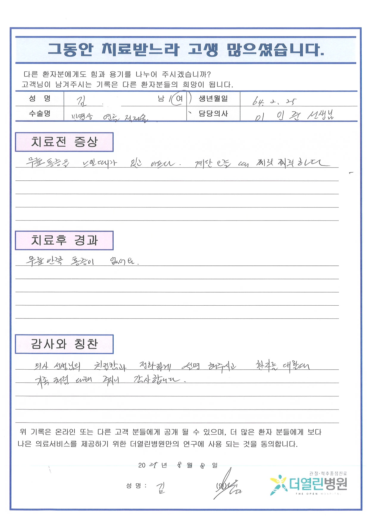 우측 관절경 반월상연골부분절제술 페이지 정보 작성자 관리자 댓글 0건 조회 34회 작성일 25-09-04 11:09 본문 목록 이전글우측 발목 관혈적 정복술 및 내고정술 25.09.04 다음글우측 반월상연골판부분절제술 25.09.04 댓글목록 댓글목록 등록된 댓글이 없습니다.