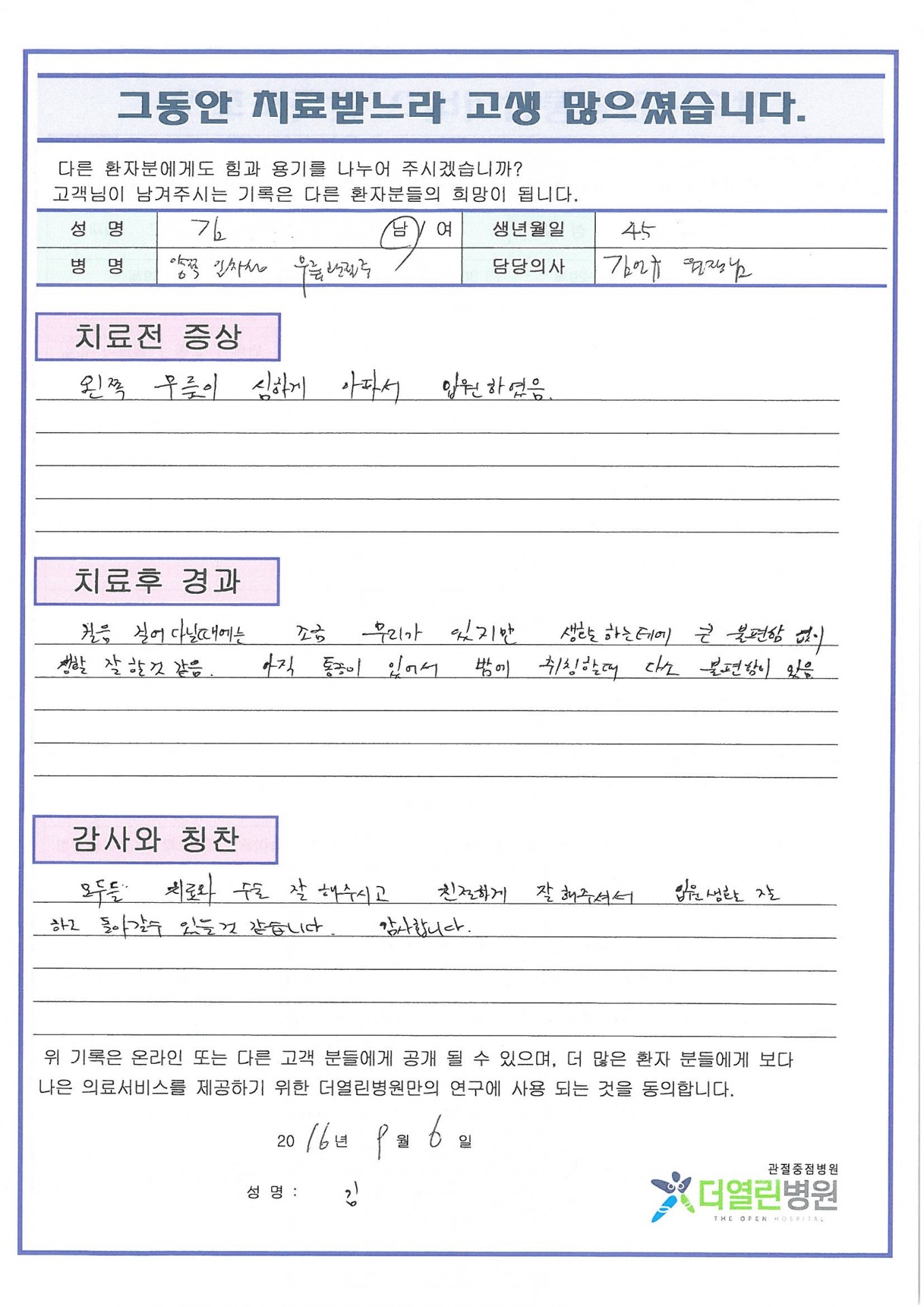 양쪽 일차성 무릎관절증 페이지 정보 작성자 관리자 댓글 0건 조회 71회 작성일 16-11-20 09:10 본문 . 목록 이전글원발성 무릎관절증 16.11.20 다음글오래된 내측반달연골의 찢김 16.11.20 댓글목록 댓글목록 등록된 댓글이 없습니다.