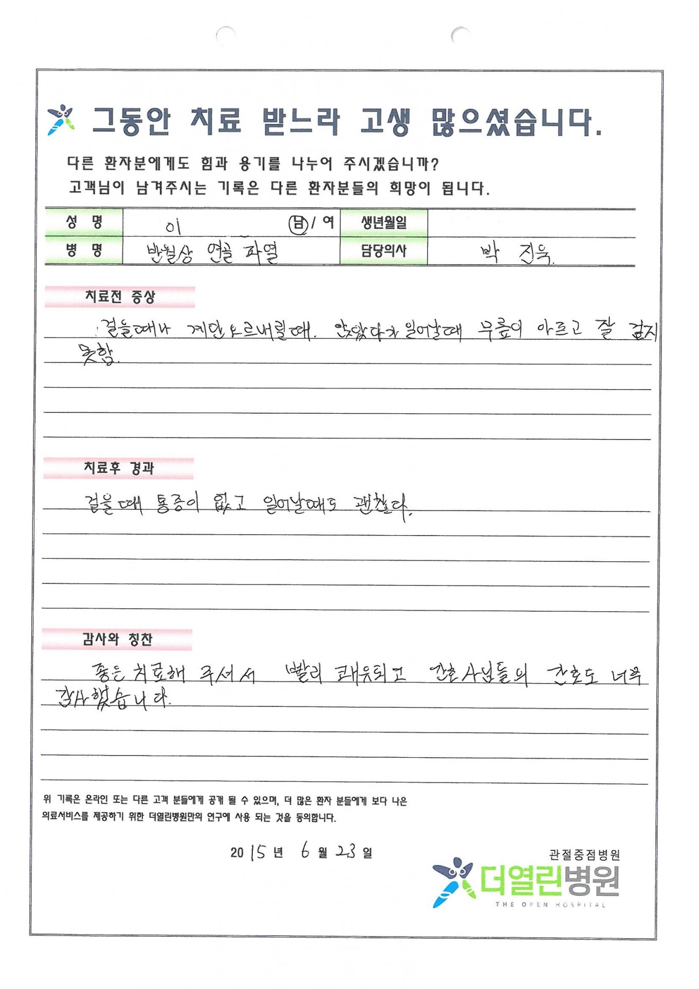 좋은 치료해 주셔서 빨리 쾌유되고 간호사님들의 간호도 너무 감사했습니다.