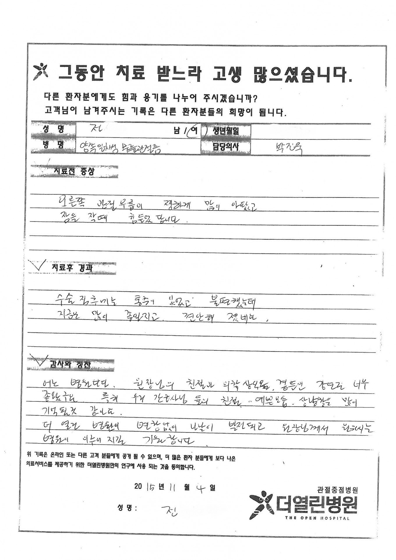 양쪽 무릎 인공관절 치환술 페이지 정보 작성자 관리자 댓글 0건 조회 83회 작성일 15-11-10 09:21 본문 . 목록 이전글반월상 연골 절제술 15.11.10 다음글양쪽 무릎 인공관절 치환술 15.11.10 댓글목록 댓글목록 등록된 댓글이 없습니다.