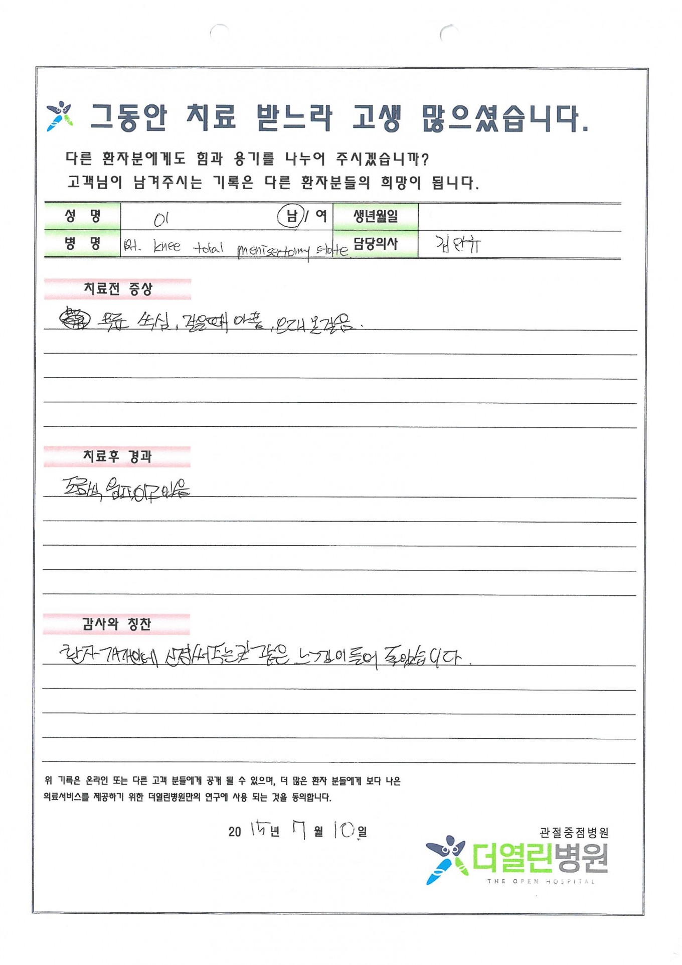 환자 개개인에 신경써주는 것 같은 느낌이 들어 좋았습니다.