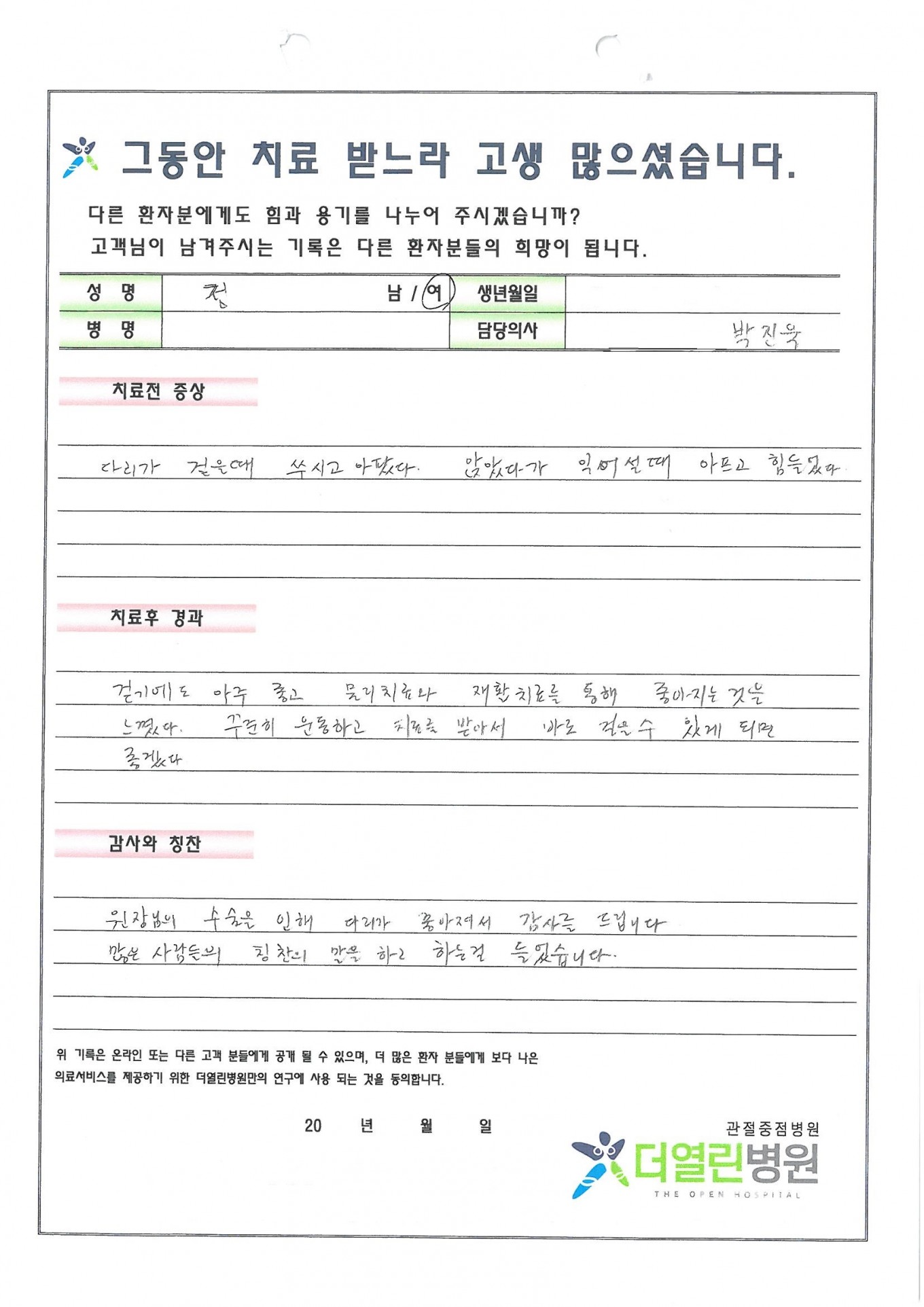 박진욱 원장님 페이지 정보 작성자 관리자 댓글 0건 조회 120회 작성일 15-10-07 15:40 본문 원장님의 수술로 인해 다리가 좋아져서 감사를 드립니다. 많은 사람들이 칭찬의 말을 하는걸 들었습니다. 목록 이전글박진욱 원장님 15.10.07 댓글목록 댓글목록 등록된 댓글이 없습니다.