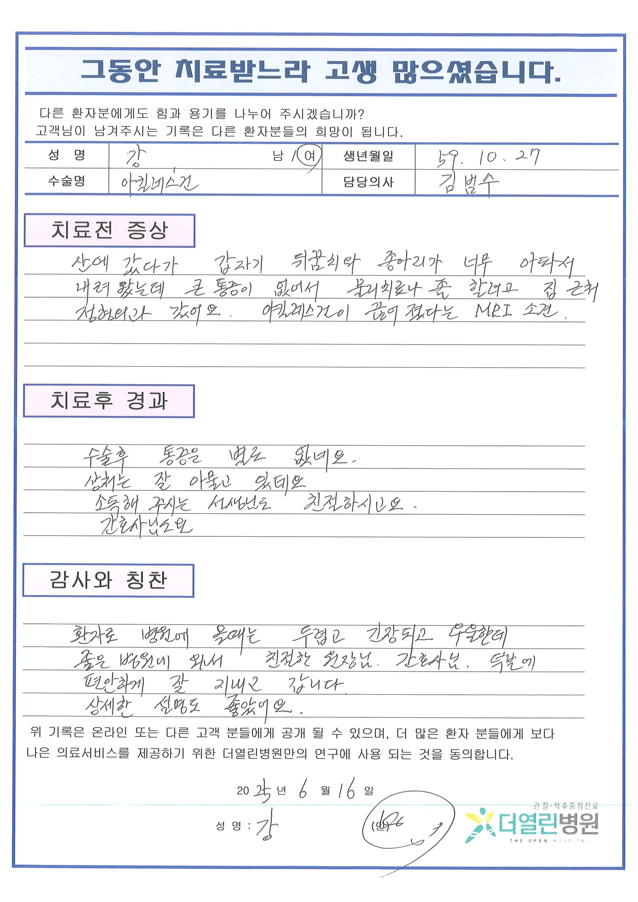 우측 아킬레스 건 봉합술 페이지 정보 작성자 관리자 댓글 0건 조회 42회 작성일 25-07-02 15:09 본문 목록 이전글좌측 발목 관혈적 정복술 및 금속 고정술 25.07.02 다음글우측 슬관절 반월상연골판부분절제술 및 연골 국소 유리체 박리술 25.07.02 댓글목록 댓글목록 등록된 댓글이 없습니다.